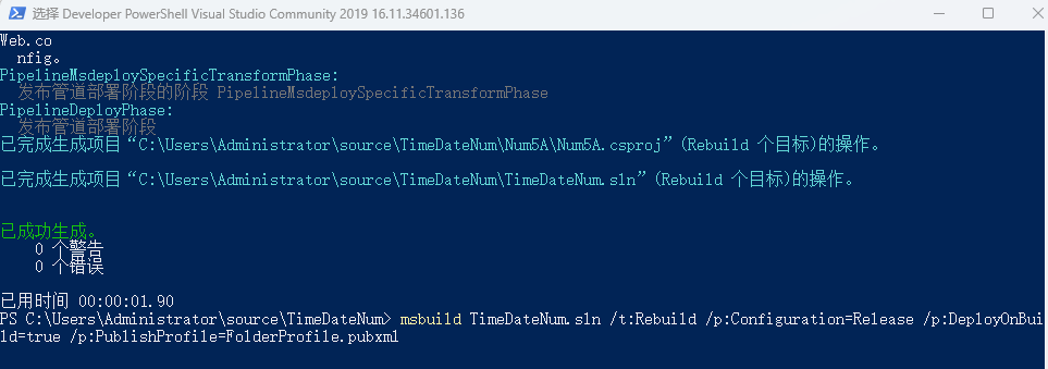 要先打开 PowerShell,然后进入当前解决方案目录,执行下面的命令,就可以批理一次发布生成多个网站了,注意一定要先手动发布一次,会在Properties目录下面的PublishProfiles目录下面生成一个FolderProfile.pubxml文件,要在命令中用到这个文件名称,我用的是文件夹模式。