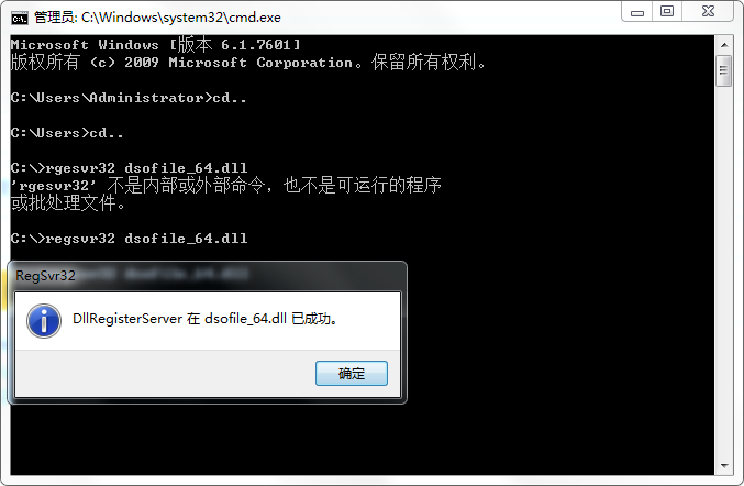 2、在命令行窗口中输入 regsvr32 dsofile_64.dll ,然后回车,会提示注册成功。