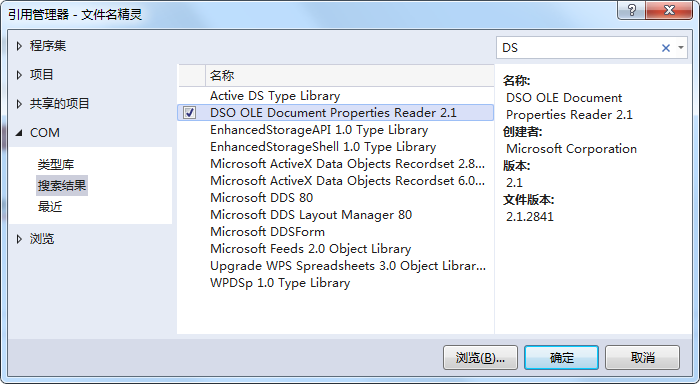 3、在Visual Studio中添加引用,选中 DSO OLE Document Properties Reader 2.1。
