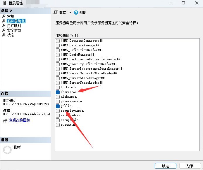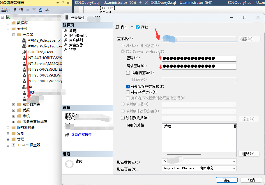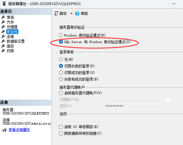 要注意在服务器属性中的安全性选项卡中,修改服务器身份验证为:SQL Server和 Windows身份验证模式。