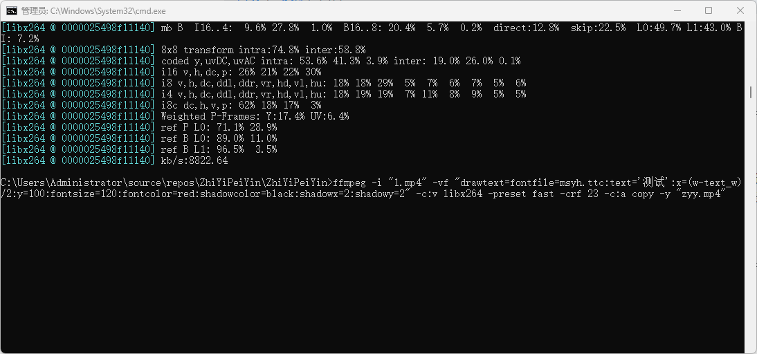 C:\Users\Administrator\source\repos\ZhiYiPeiYin\ZhiYiPeiYin>ffmpeg -i "1.mp4" -vf "drawtext=fontfile=msyh.ttc:text='测试':x=(w-text_w)/2:y=100:fontsize=120:fontcolor=red:shadowcolor=black:shadowx=2:shadowy=2" -c:v libx264 -preset fast -crf 23 -c:a copy -y "zyy.mp4"
