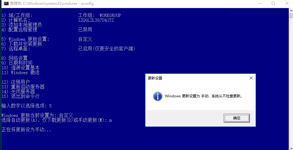 首先以管理员身份打开命令提示符(CMD),输入sconfig并回车启动配置工具;在弹出的菜单中选择 “5 - Windows Update Settings” 选项;
