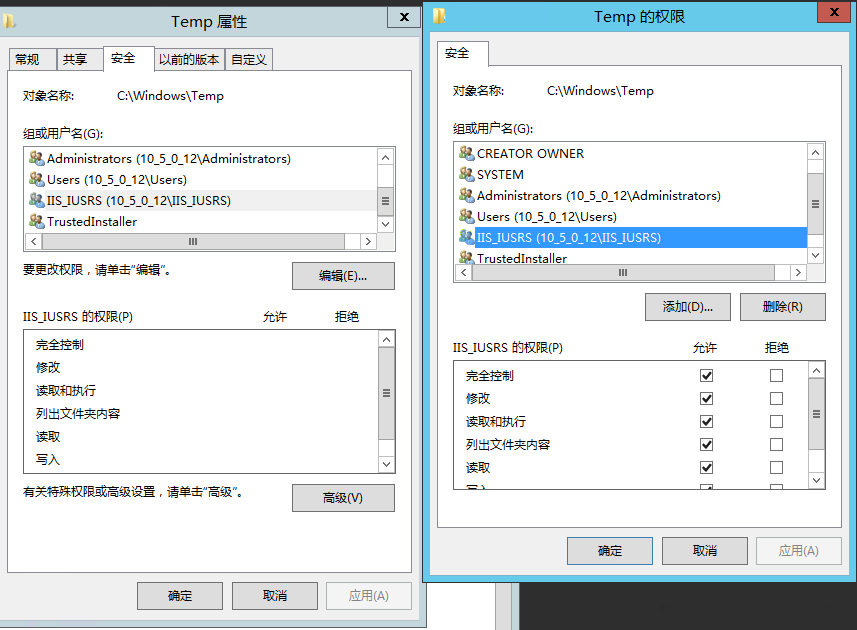 对 C:\Windows\Temp 文件夹添加 IIS_Users的所有权限。