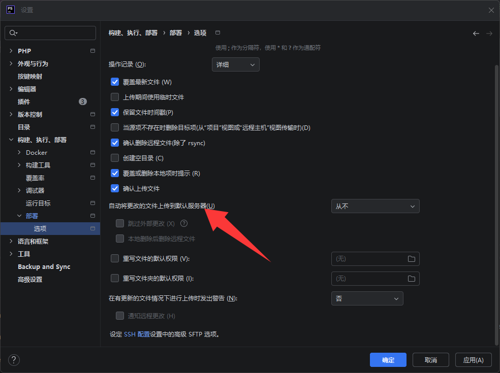 勾选「always」:修改文件后,即使只是自动保存(PHPStorm 默认 10 秒自动保存),也会触发上传;